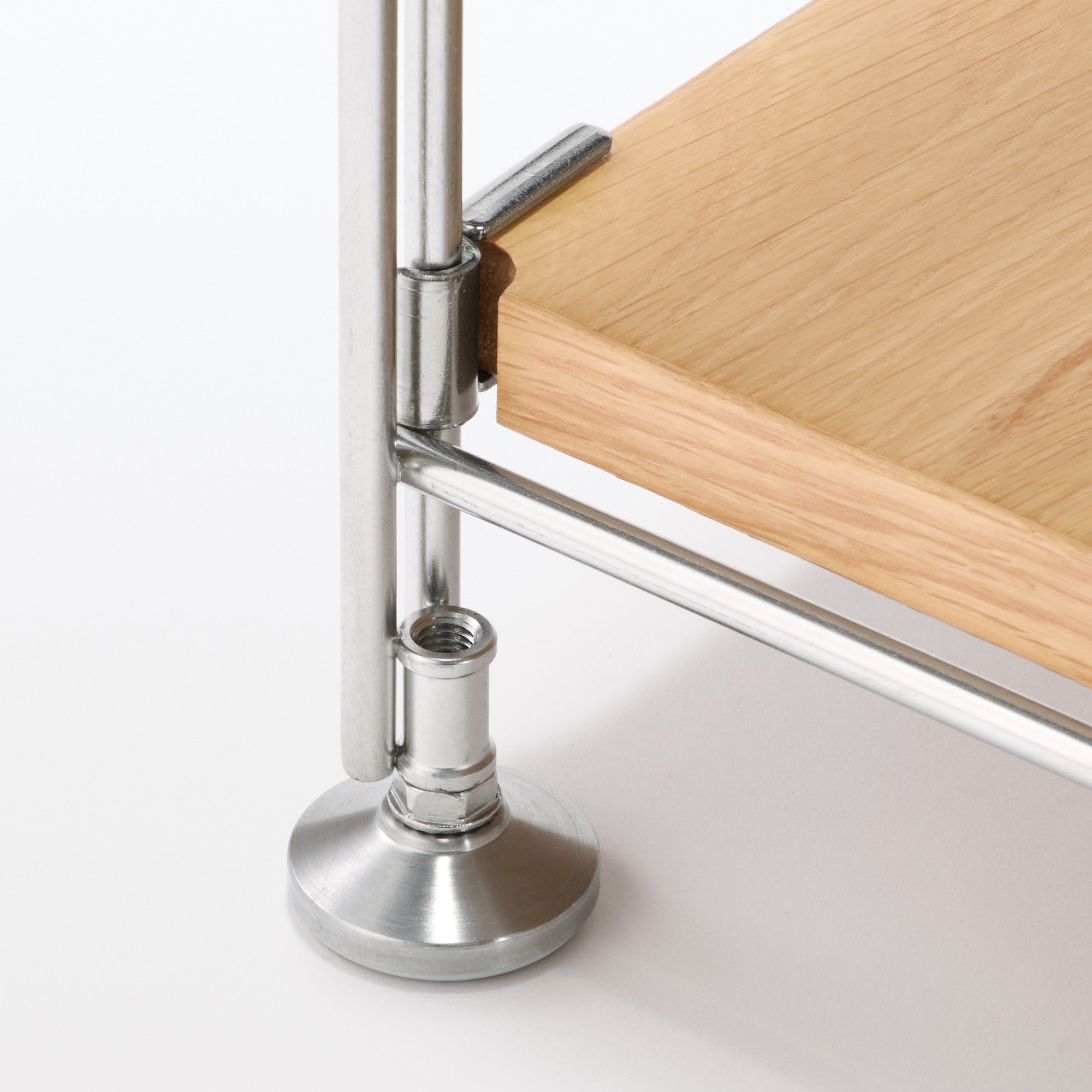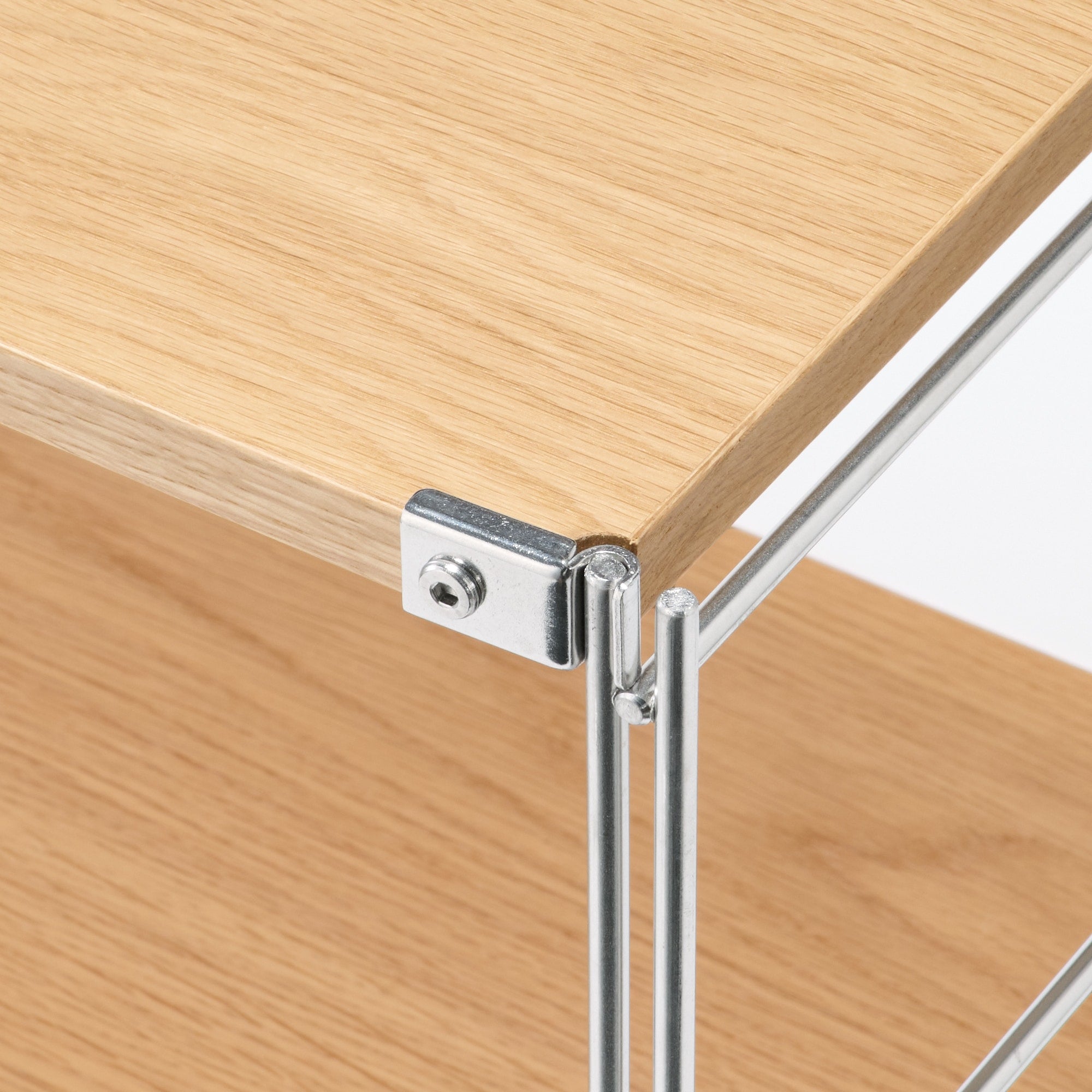 ステンレスとオーク材を組み合わせたオープンシェルフです。ユニット式なので、くらしの変化や好みに合わせて、帆立、棚、ワードローブバーなどオプションパーツの組み換えができます。※この商品には突板を使用しています。