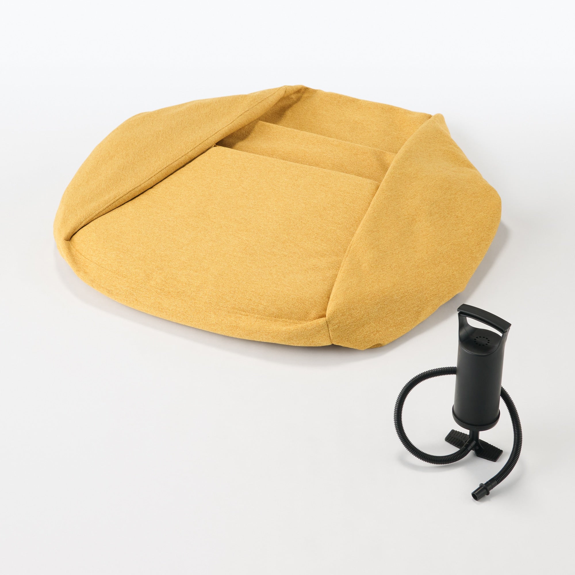 商品サイズ:幅95cm×奥行95cm高さ72.5cm 空気を使うことで省資源、省スペース、軽量コンパクトのソファを作りました。付属のポンプで空気を入れて使うコンパクトな一人掛けのソファです。空気の充填量で座り心地が変わり、お好みの座り心地に調整できます。また、空気を使用しているので軽く、移動や掃除も楽に行えます。