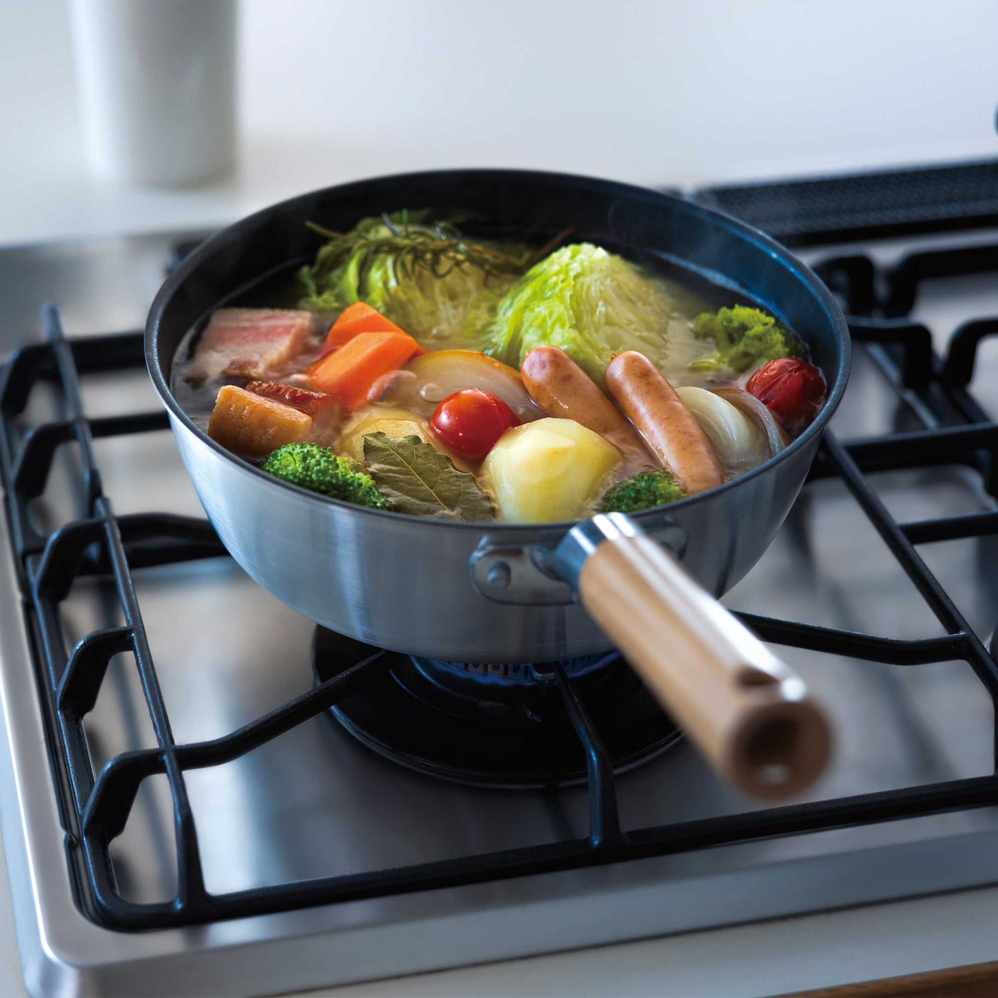 「焼く」「煮る」の調理を集約。「炒める」「蒸す」「揚げる」「炊く」もできる6役のフライパンです。こびりつきにくい、高密度3層構造で、お手入れも簡単です。※調理の際は、まんべんなく油をひいてください。