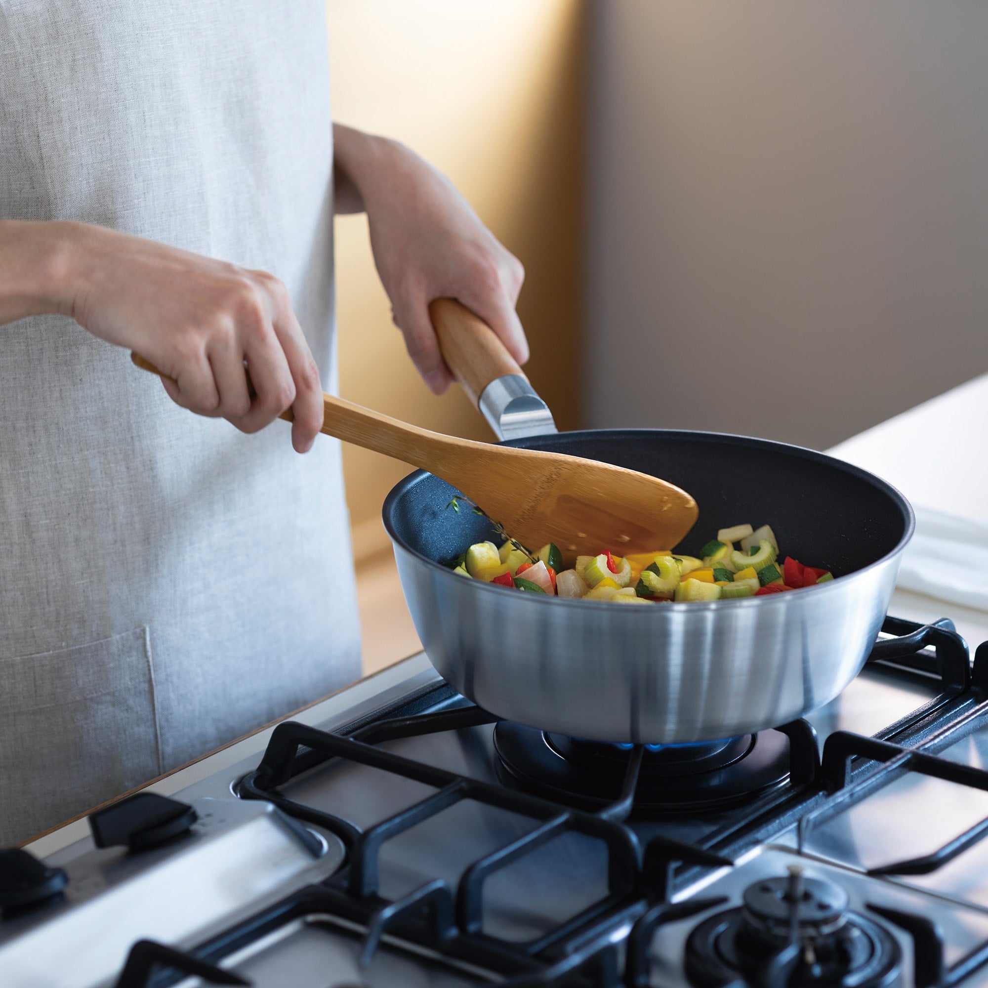 「焼く」「煮る」の調理を集約。「炒める」「蒸す」「揚げる」「炊く」もできる6役のフライパンです。こびりつきにくい、高密度3層構造で、お手入れも簡単です。※調理の際は、まんべんなく油をひいてください。