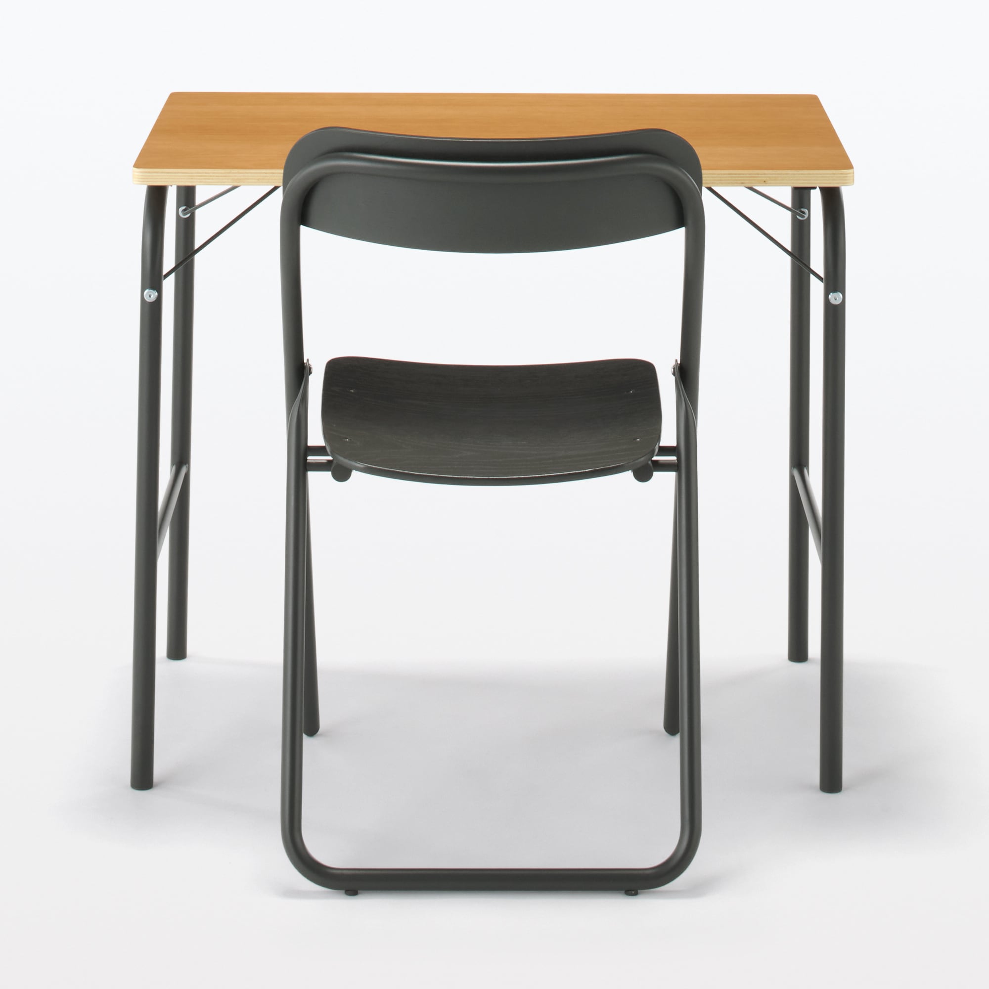 曲げたスチールパイプに板を取り付けたシンプルなテーブルです。使わないときはたたむことで、省スペースで保管ができます。同シリーズの折りたたみチェアと色を合わせて使えます。