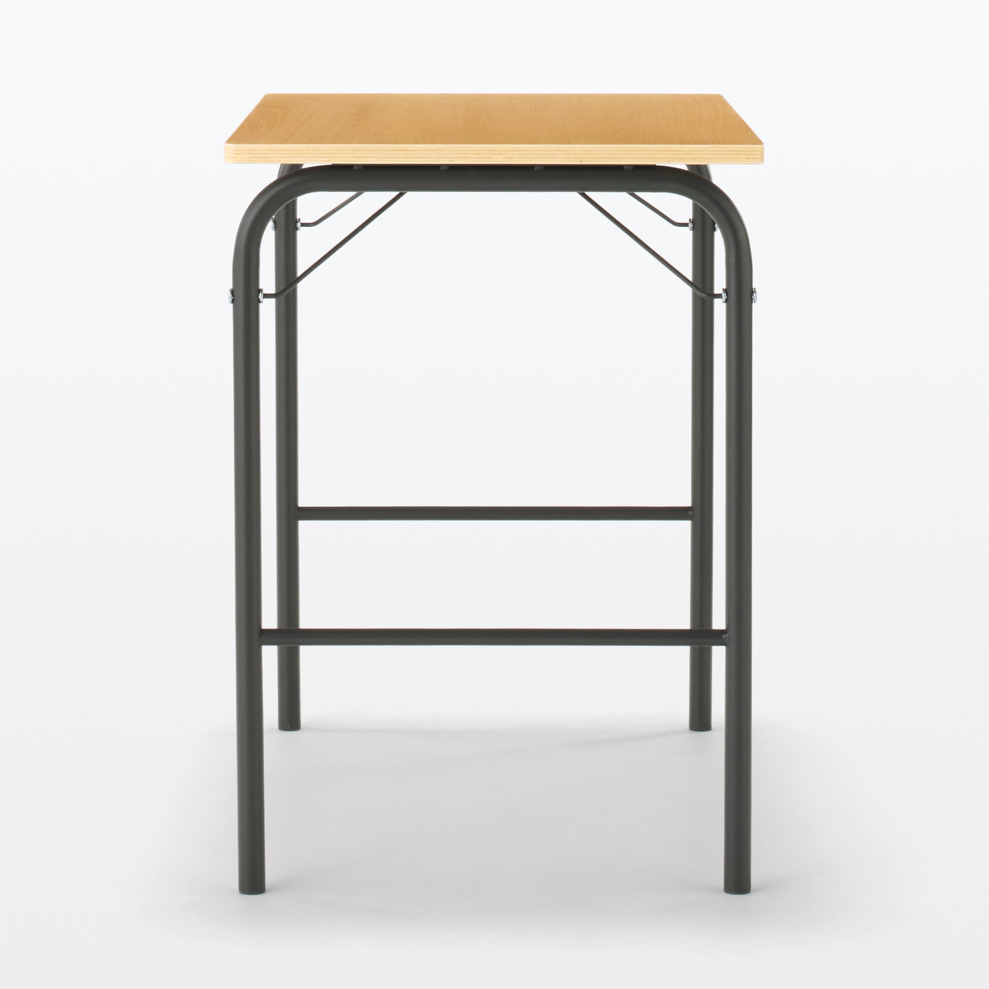 曲げたスチールパイプに板を取り付けたシンプルなテーブルです。使わないときはたたむことで、省スペースで保管ができます。同シリーズの折りたたみチェアと色を合わせて使えます。