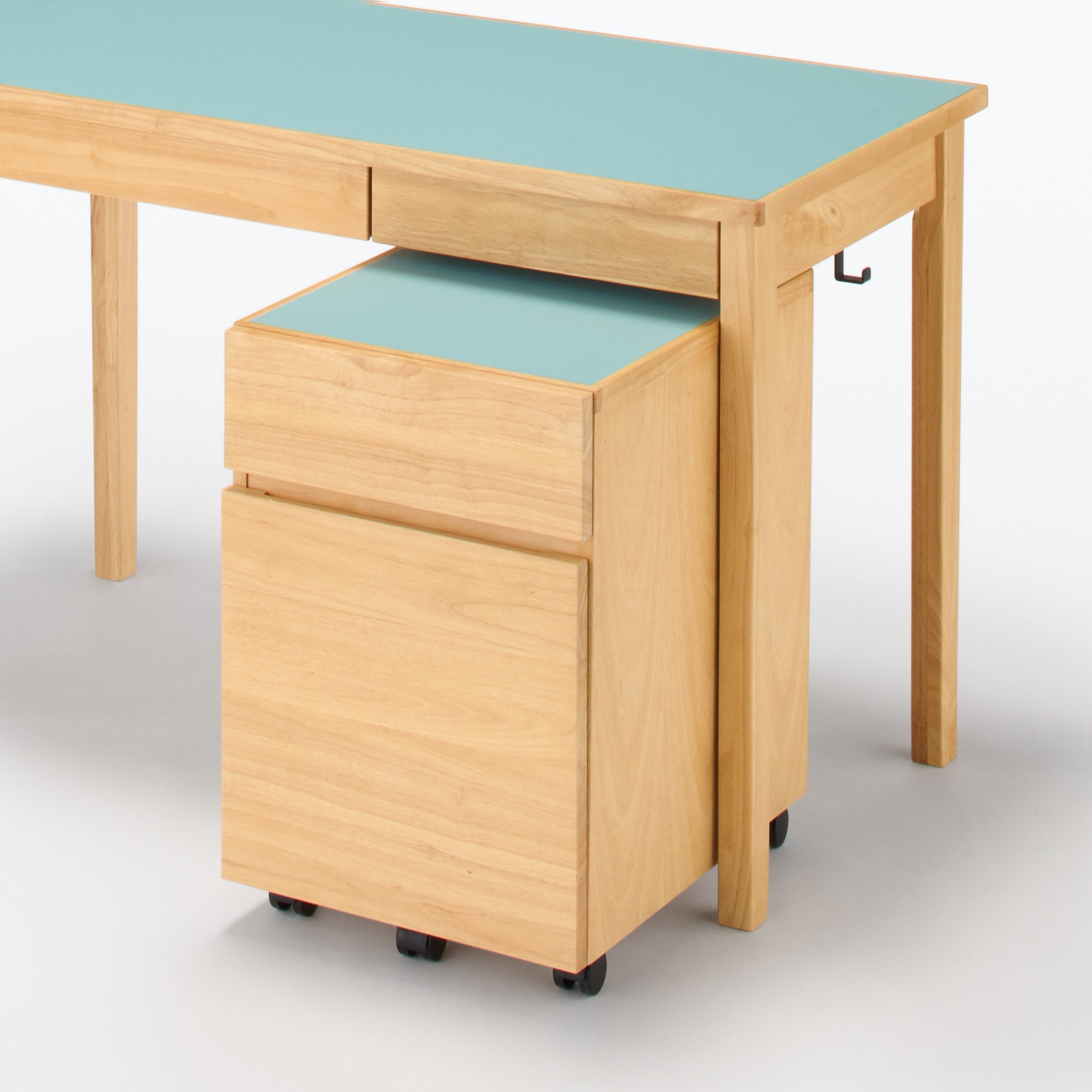 オーク材デスクをお持ちのお客さまが追加で購入しても自宅の中で合わせやすいよう、既存の木製デスク オーク材とデザインを合わせています。