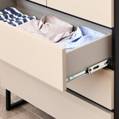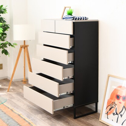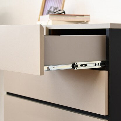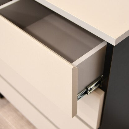 側面や脚、引出しの間から覗く黒色がアクセントになり、シンプルながらもより品のあるデザインとなっております。