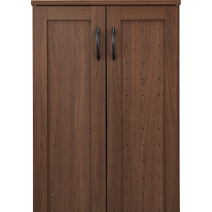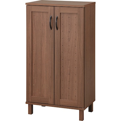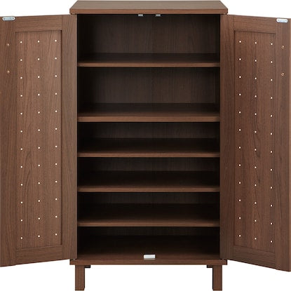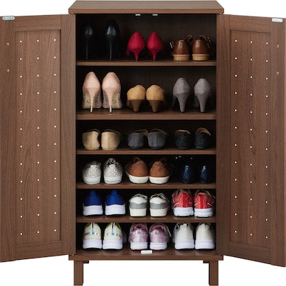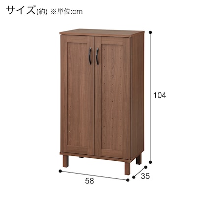 扉正面はパンチング扉(穴あき加工)で、通気性がよく臭気がこもりにくくなっています。 棚板の高さを変えられるので、ヒールやブーツなども収納でき、 棚板を外せばロングブーツも収納可能です。 ロータイプなので圧迫感を軽減してくれます。 シューズボックスとしてだけでなく、多目的のストッカーとしても使用できるすっきりとシンプルなデザインです。こちらは幅58cmタイプです。最大18足収納可能です。 ※収納可能数は、靴の形状によって異なります。※イメージ画像の場合、使用している小物等は演出品です。