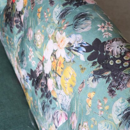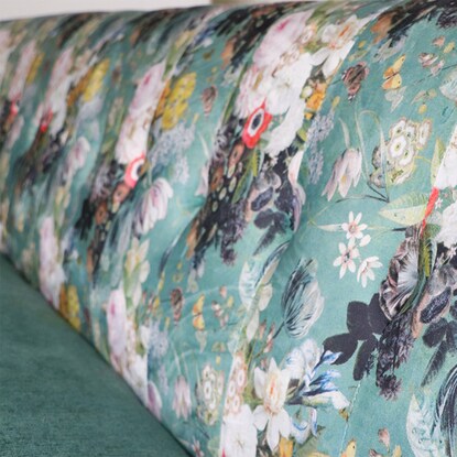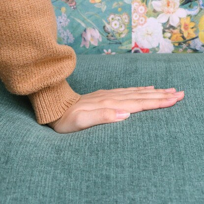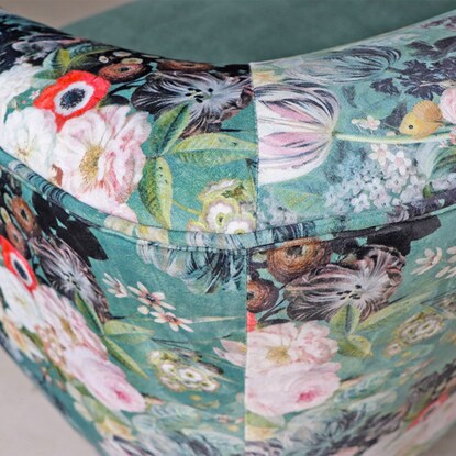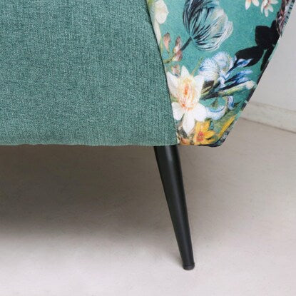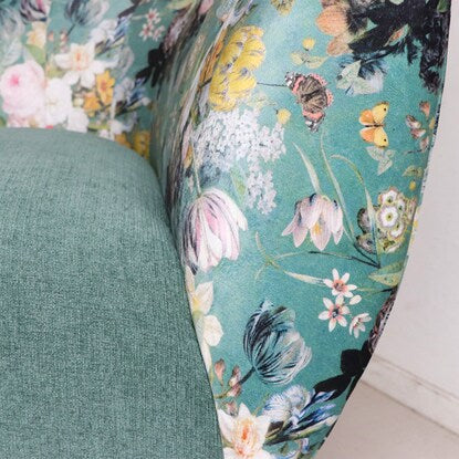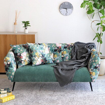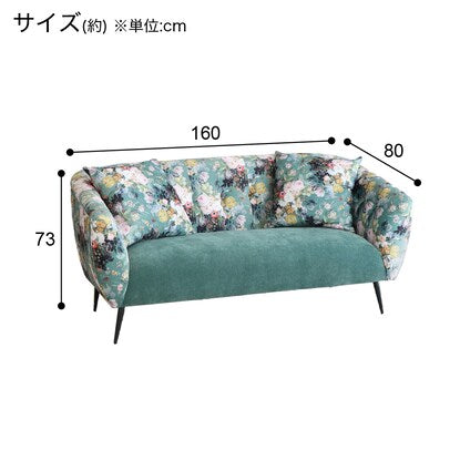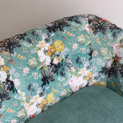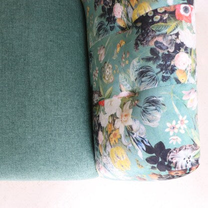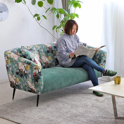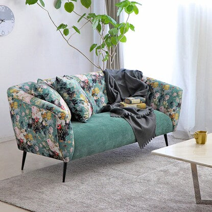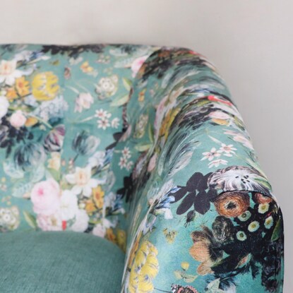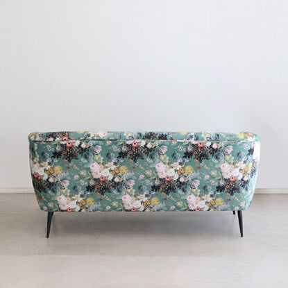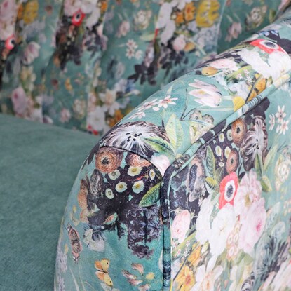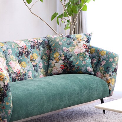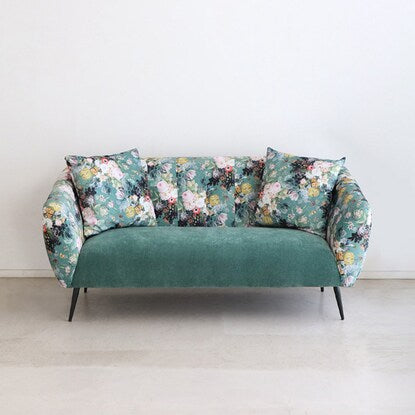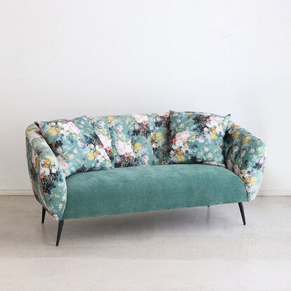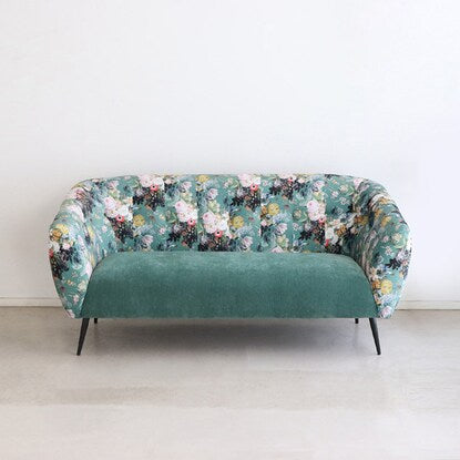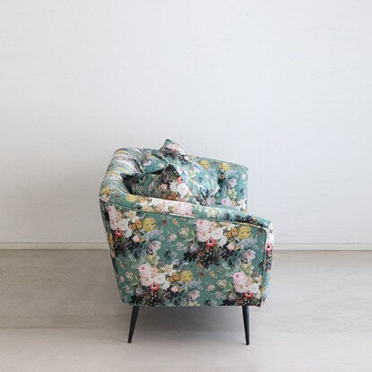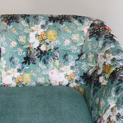 丸みのあるフォルムと落ち着いたグリーンのカラー、鮮やかで大きな花柄が目を引く華やかなソファです。