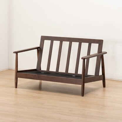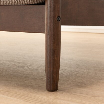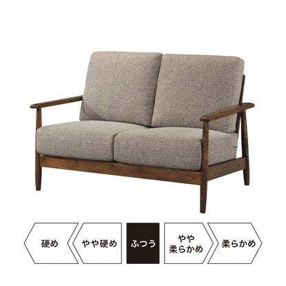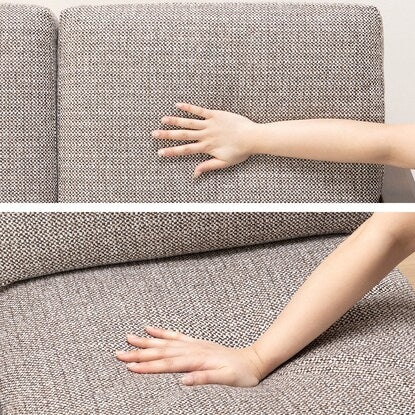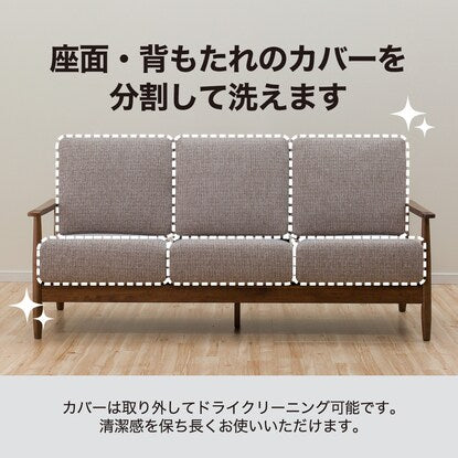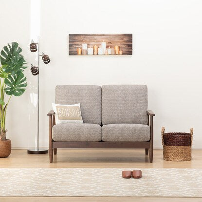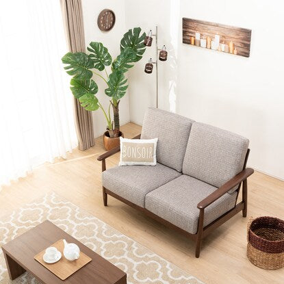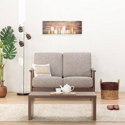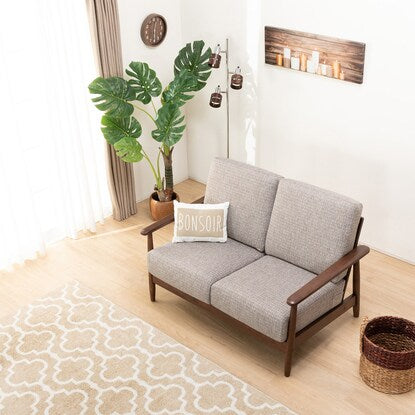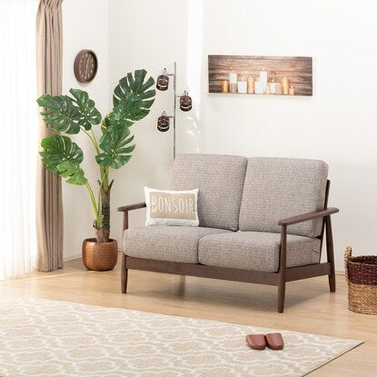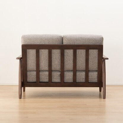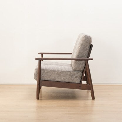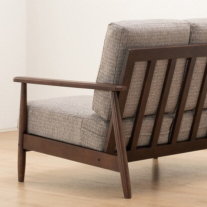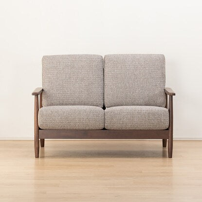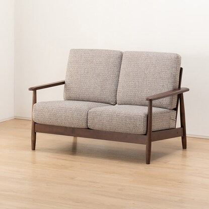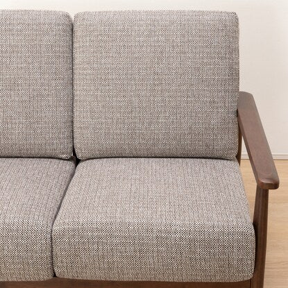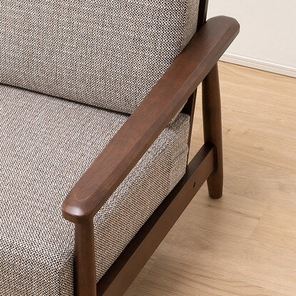 木製ヒジと、温もりのあるファブリック素材を使用したソファです。