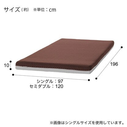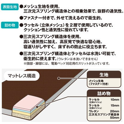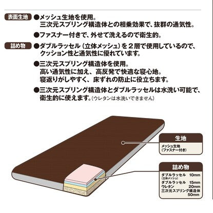 メッシュ生地を使用。 三次元スプリング構造体との相乗効果で、抜群の通気性です。 ファスナー付きで、外せて洗えるので衛生的。ダブルラッセル(立体メッシュ)を2層で使用しているので、クッション性と通気性に優れています。 三次元スプリング構造体で、高い通気性に加え、高反発で快適な寝心地です。 寝返りがしやすく、床ずれの防止に役立ちます。 三次元スプリング構造体とダブルラッセルは水洗い可能で、衛生的にご使用いただけます。 ※ウレタンは水洗いできません。こちらはシングルサイズです。※厚さ約10㎝(一番膨らんでいる箇所を計測しています)【表面生地】 ファスナー付きメッシュ生地【詰め物】 立体メッシュダブルラッセル(10mm)、ダブルラッセル(15mm)、ウレタン(20mm)、三次元スプリング構造体(50mm)