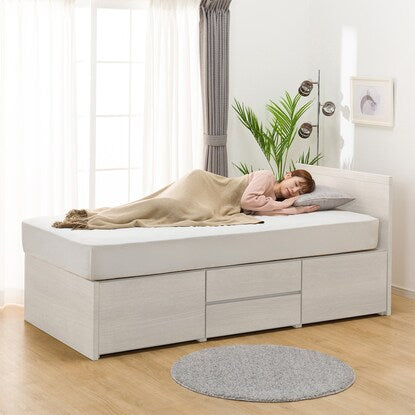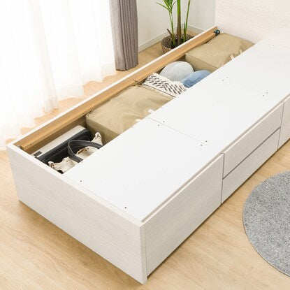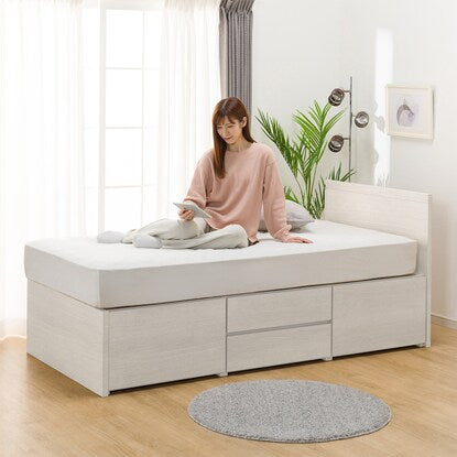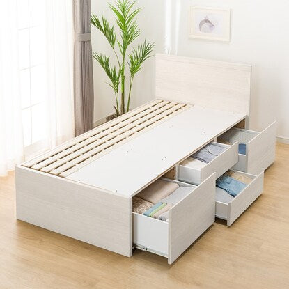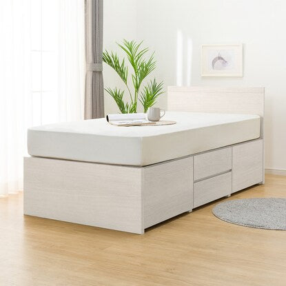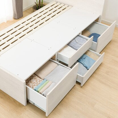 大小の引き出しで分類収納が可能なベッドフレームです。