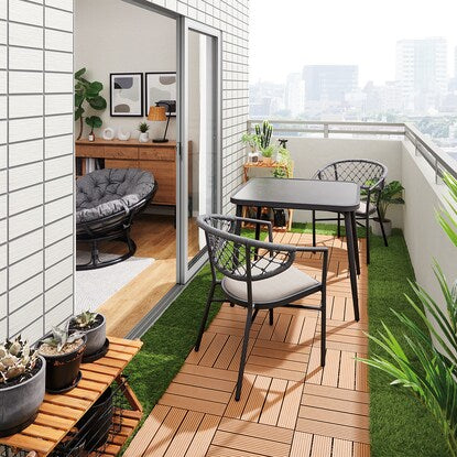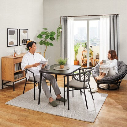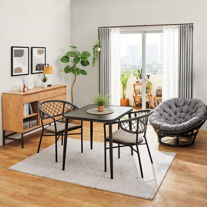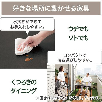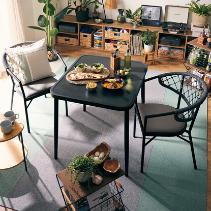 【IN/OUTDOOR 】シリーズは水拭きができてお手入れしやすく、普段はお部屋の中で、天気のいい日はベランダで食事を楽しめます。