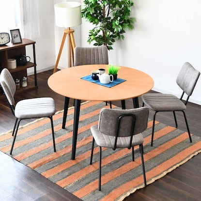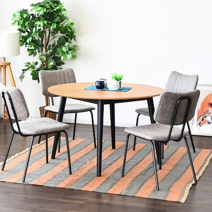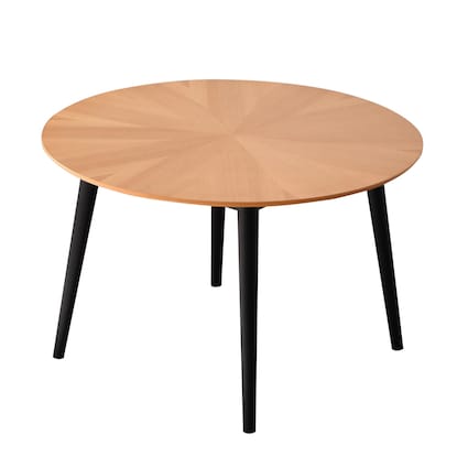 ※使用している小物等は演出品です。中央から外側に向かって木目を配した、「光線貼り」と呼ばれる美しいデザインが特徴です。 天板は天然木を薄くスライスし貼り合わせた、オーク材の突板仕様。 無垢材に比べ反りや割れがなく、安定した素材。木のぬくもりが感じられる質感です。 天然木の脚はモダンなブラック色。天板との2色使いで合わせられるチェアの幅が広がります。※特殊加工のデザインにより、隣り合わせの木目の色に差が生じる場合があります。予めご了承ください。