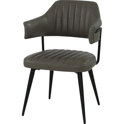 インダストリアルな雰囲気ののモダンなワークチェア。細身の4本脚がすっきりとしてシンプルですが、印象的なお部屋を演出します。背もたれと肘が一体型なので腰部分をしっかりサポートしてくれます。合成皮革生地で水拭きできてお手入れが簡単です。※こちらは一般家庭向けの商品です。 業務使用を前提とした構造にはなっておりません。