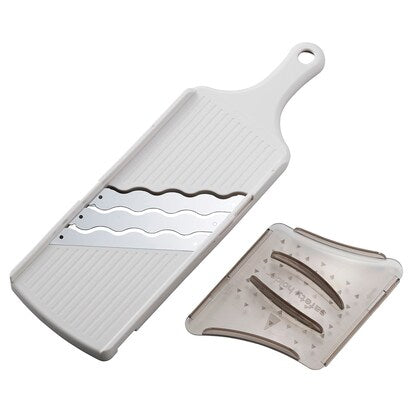 抵抗が少なく軽い力で下ろせる「ウェーブ刃」を採用 3枚刃で高速スライス、超・時短調理を実現【特長】 ①3枚刃で高速スライス!調理の手間を大幅カット 今までにない'3枚刃構造'で超・時短調理を実現。キャベツをはじめ、タマネギ、キュウリなどあっと言う間に山盛りのスライスが出来上がります。 ②波刃で'優れた切れ味'軽い力でササッと切れる! 普通の直線刃で一度に3回カットするとかなり強い加重がかかりますが、この波刃なら、その抵抗感を感じさせず軽い力で滑らかにスライスすることができます。その秘密は、緩急の斜面で構成されているウェーブ形状にあります。この緩急のカーブの繰り返しで、優れた切れ味を実現!抵抗が少なく、スピーディーに調理することができます。 ②ボディにセットOK!安全ホルダーで安心スライス 野菜をしっかりとグリップでき、安全に調理することができます。また、ボディにセットできるので切れ刃のカバーにもなり保管時にも安全です。スライサーボディー:幅10×奥行32×高さ3cm 安全ホルダー:幅10.5×奥行15×高さ3cmスライサーボディー:ABS樹脂(耐熱80℃) 安全ホルダー:ABS樹脂(耐熱80℃) 切れ刃:ステンレス刃物鋼【お手入れの方法】 ご使用前に食器用洗剤などでよく洗ってください。 使用後は付着物を取り除き水洗いした後、十分水気をふき取ってください。【取り扱い上のご注意】 調理の目的以外には使用しないでください。 乳幼児の手の届かない安全な場所に保管してください。 小さなお子様だけでの使用は絶対にしないでください。 刃物ですので取り扱いには十分注意してください。 平らな安定したところで使用してください。 材料が小さくなってきたら手を切ることがありますので危険と判断されたところで止めて、後は包丁で切ってください。 通常のスライサーと比べると食材の減り方が早いので、必ず、付属の安全ホルダーを使用してください。 洗浄の際は刃先に十分注意してください。 破損または変形した場合は使用しないでください。 強い衝撃を与えると破損の原因になります。 にんじんなど野菜によっては野菜の色素で染まることがありますが、害はありません。 コンロなど火のそばに置かないでください。変形の原因になります 食器洗い乾燥機や食器乾燥機には使用できません。 金属タワシやみがき粉で洗うと傷が付きます。 汚れなどが付着したまま放置するとサビが発生する原因になります。