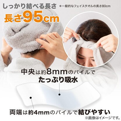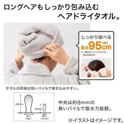 一般的なフェイスタオルの長さ80cmにくらべこのタオルは95cmの長さでロングヘアもしっかりと包みこむヘアドライ用タオルです。