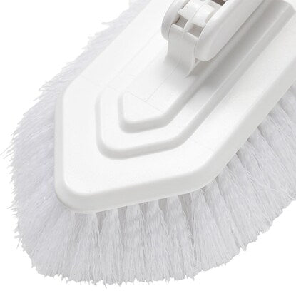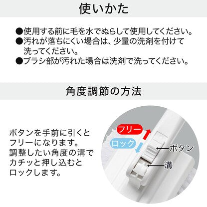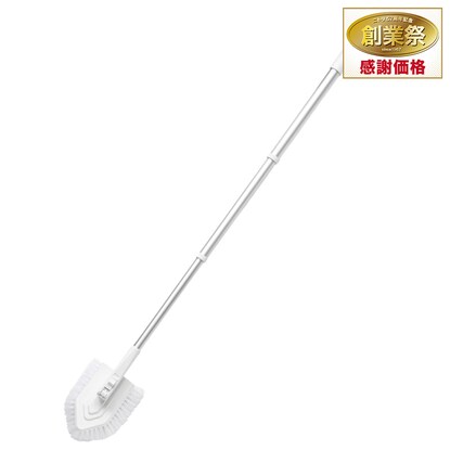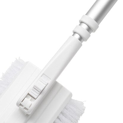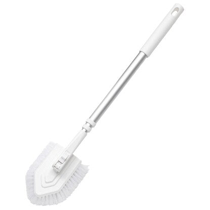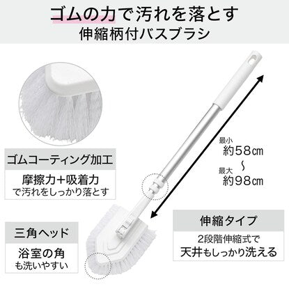 洗剤なしで浴室の床、浴槽、風呂イス、シャワーホースなどこれひとつで掃除ができる 傷が付きにくく、樹脂やステンレス、陶器など素材を気にせず掃除ができる 摩擦力+吸着力で、軽い力で汚れが落とせる 3段階・角度調整でヘッドの角度が変わる 2段階伸縮式で天井もしっかり洗える(最小約58cm~最大約98cm) 三角ヘッドで浴室の角も洗いやすい本体:ポリプロピレン、ABS樹脂 柄:アルミニウム、ポリプロピレン 毛:ポリプロピレン(アクリルゴム加工)【耐熱温度】 90℃【使いかた】 使用する前に毛を水でぬらして使用してください。 汚れが落ちにくい場合は、少量の洗剤を付けて洗ってください。 ブラシ部が汚れた場合は洗剤で洗ってください。【角度調整の方法】 ボタンを手前に引くとフリーになります。調整したい角度の溝でカチッと押し込むとロックします。【取り扱い上のご注意】 火のそばや高温になる場所には置かないでください。 無理な力でこすったりしないでください。破損の原因になります。 傷付きが心配な場合は、目立たない部分で試してから使用してください。 本体の硬い部分があたると傷を付けるおそれがありますので注意してください。 洗剤を使用する場合は必ず中性洗剤を使用してください。 塩素系、酸素系の洗剤や漂白剤、d-リモネンを含む洗剤は本品を劣化させるおそれがありますので、使用しないでください。 使用後はよく洗い、水を切って乾燥させて保管してください。 本品は消耗品です。使用を続けることにより素材が摩耗、劣化します。使用・保管状況によっては比較的早く摩耗、劣化することがあります。 お子さまの手の届かないところに保管してください。 本品は浴室(壁面・床面)清掃用です。本来の用途以外に使用しないでください。 廃棄時は各自治体の定める方法に従って処理してください。