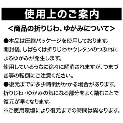 パッケージの形状でしばらくは折りじわが発生します。2~3日程度でなじみますが、つまずき等の転倒にご注意ください。