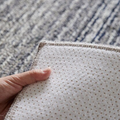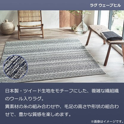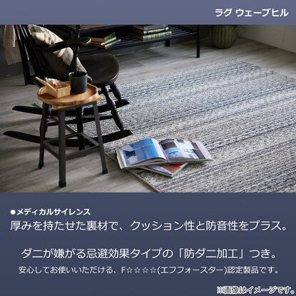 ラグ ウェーヴヒル 日本製・ツイード生地をモチーフにした、複雑な織り組織のウール入りラグ。 異素材の糸の組み合わせや、毛足の高さや形状の組合せで、豊かな質感を楽しめます。 ラグ ウェーヴヒル メディカルシート 環境にも肌にも優しく、安全な医療用素材を用いた裏材を使用しています。 メディカルストップ やさしい裏材を使用した、ドットタイプの滑り止め加工付き。 床暖房やホットカーペットなど、熱に強い耐熱加工です。※ ※お取り扱いについては縫付ラベルをご確認ください。 ラグ ウェーヴヒル メディカルサイレンス 厚みを持たせた裏材で、クッション性と防音性をプラス。 ダニが嫌がる忌避効果タイプの「防ダニ加工」つき。 安心してお使いいただける、F☆☆☆☆(エフフォースター)認定製品です。 ※画像はイメージです。 約130×190センチ(約1.6帖) ツイード生地をモチーフにした複雑な織組織のウール入りラグ 肌に優しい医療用素材を用いた裏材(メディカルシート) 厚みを持たせた裏材でクッション性と防音性「メディカルサイレンス」付き ドットタイプの滑り止め加工(メディカルストップ) ダニが嫌がる忌避効果タイプの「防ダニ加工」 床暖やホットカーペットに熱にも強い耐熱加工 ※お取り扱いについては縫付ラベルをご確認ください。【組成・機能】 ウール78%、ポリエステル13%、ナイロン9% 防ダニ加工 ホットカーペット・床暖対応 すべり止め加工(メディカルストップ) 防音(メディカルサイレンス) F☆☆☆☆(エフフォースター)認定製品【その他】 日本製 1色展開(ネイビーのみ) こちらの商品は、丸巻きの状態でのお届けとなります。
