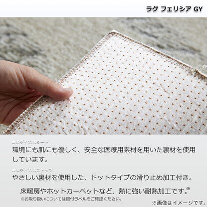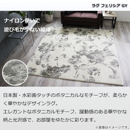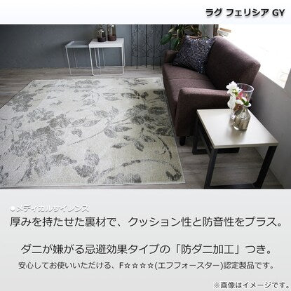 ラグ フェリシアGY ポリエステル+ナイロンで 遊び毛が少ない組成 日本製・水彩画タッチのボタニカルなモチーフが、柔らかく華やかなデザインラグ。 エレガントなボタニカルモチーフ、躍動感ある華やかな柄と光沢感で、お部屋をゆたかに彩ります。 ラグ フェリシアGY メディカルシート 環境にも肌にも優しく、安全な医療用素材を用いた裏材を使用しています。 メディカルストップ やさしい裏材を使用した、ドットタイプの滑り止め加工付き。 床暖房やホットカーペットなど、熱に強い耐熱加工です。※ ※お取り扱いについては縫付ラベルをご確認ください。 ラグ フェリシアGY メディカルサイレンス 厚みを持たせた裏材で、クッション性と防音性をプラス。 ダニが嫌がる忌避効果タイプの「防ダニ加工」つき。 安心してお使いいただける、F☆☆☆☆(エフフォースター)認定製品です。 ※画像はイメージです。 約130×190センチ(約1.6帖) 水彩画タッチのボタニカルモチーフが柔らかく華やかなデザインラグ ナイロン使いで遊び毛が少ない組成 肌に優しい医療用素材を用いた裏材(メディカルシート) 厚みを持たせた裏材でクッション性と防音性「メディカルサイレンス」付き ドットタイプの滑り止め加工(メディカルストップ) ダニが嫌がる忌避効果タイプの「防ダニ加工」 床暖やホットカーペットに熱にも強い耐熱加工 ※お取り扱いについては縫付ラベルをご確認ください。【組成・機能】 ナイロン100% 防ダニ加工 ホットカーペット・床暖対応 すべり止め加工(メディカルストップ) 防音(メディカルサイレンス) F☆☆☆☆(エフフォースター)認定製品【その他】 日本製 3色展開(ベージュ・グレー・パープル) こちらの商品は、丸巻きの状態でのお届けとなります。