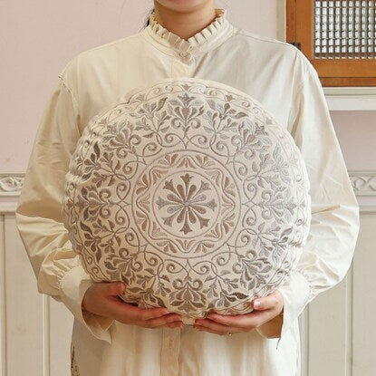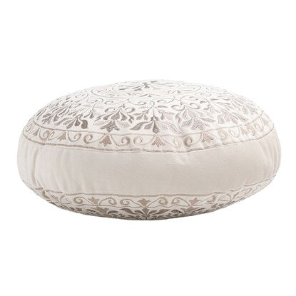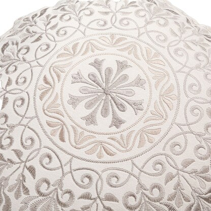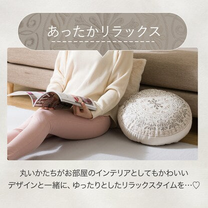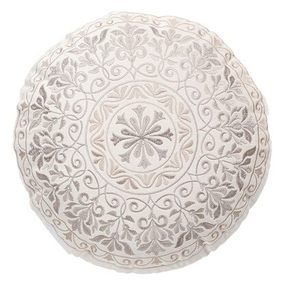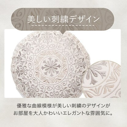 おしゃれなオリジナルデザインの商品を多数販売中!優雅な曲線模様が美しい刺繍のデザインがお部屋を大人かわいいエレガントな雰囲気に。美しい刺繍とやわらかくなめらかな肌ざわりで思わず抱きしめたくなる♡丸いかたちがお部屋のインテリアとしてもかわいいデザインと一緒に、ゆったりとしたリラックスタイムを…♡ 直径40×6cm【組成】 表生地:ポリエステル100% 裏生地:ポリエステル100% 充填物:ポリエステル100%手洗可【取り扱い上のご注意】 形を整えて干してください。乾燥機のご使用はお止めください。 乾燥させてから湿気の少ない場所に保管してください。 また、ダニやカビ防止のため使用しない間でも時々保管場所の換気をして乾燥させてください。 転倒のおそれがありますので、商品の上に立ち上がったり、飛び跳ねたりしないでください。 ※「デコホーム」は、ニトリから生まれたインテリア雑貨のお店です。普段使いの日用品からお部屋のアクセントになるアイテムまで品質やデザインはもちろん、お手軽な価格で取り揃えています。