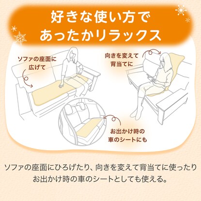 ソファの座面にひろげたり、向きを変えて背当てに使ったりお出かけ時の車のシートとしても使える。