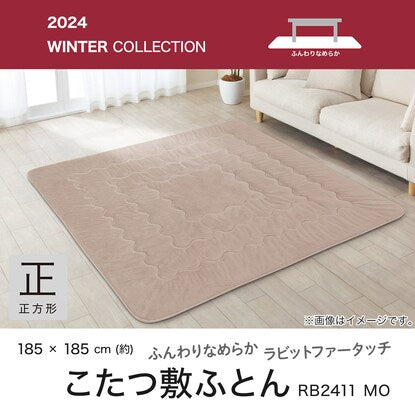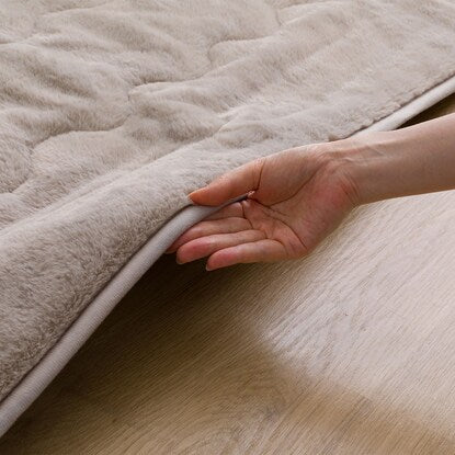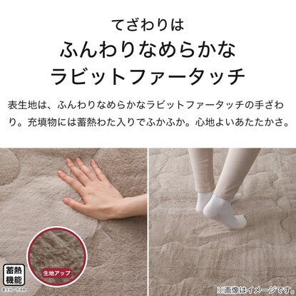 表生地は、ふんわりなめらかなラビットファータッチの手ざわり。充填物には蓄熱わた入りでふかふか。心地よいあたたかさ。