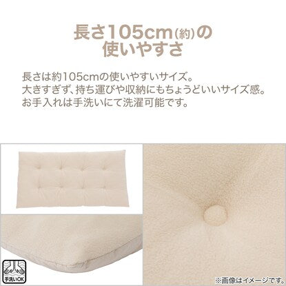 ※画像はイメージです。 ふわふわやわらかな使い心地 短い起毛生地で肌ざわりやわらか、ふわふわした使い心地。のんびりおうち時間のおともに。お昼寝にもおすすめ。 長さ105cm (約)の使いやすさ 長さは約105cmの使いやすいサイズ。 大きすぎず、持ち運びや収納にもちょうどいいサイズ感。 お手入れは手洗いにて洗濯です。 ※画像はイメージです。 ■組成 表生地:ポリエステル100% 充填物:ポリエステル100% 裏生地:ポリエステル100%■手洗いOK