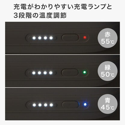 残量がわかりやすい充電ランプと3段階の温度調節。