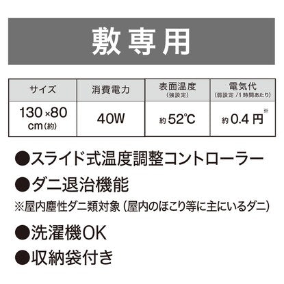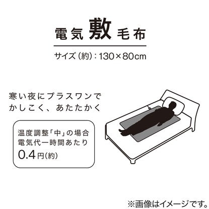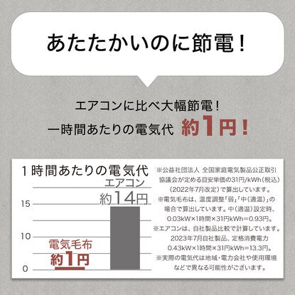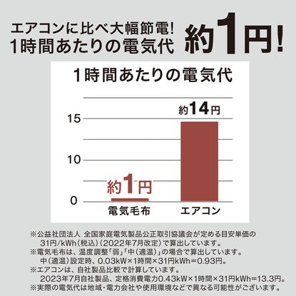 寒い夜にプラスワンでかしこく、あたたかく。 強・中・弱の温度調節ができます。 「強」に設定するとダニ退治機能が働きます。 汚してしまってもご家庭の洗濯機で洗える。 ※ドラム式洗濯機では、洗濯できません。 ※コントローラーは外してください。 エアコンに比べ大幅節電! 一時間あたりの電気代 約1円* ※公益社団法人 全国家庭電気製品公正取引協議会が定める目安単価の31円/kWh(税込)(2022年7月改定)で算出しています。 ※電気毛布は、温度調整「弱」「中(適温)」の場合で算出しています。中(適温)設定時、0.03kW×1時間×31円kWh=0.93円。 ※エアコンは、自社製品比較で計算しています。2023年7月自社製品、定格消費電力0.43kW×1時間×31円kWh=13.3円。 ※実際の電気代は地域・電力会社や使用環境などで異なる可能性がございます。 ※画像はイメージです。サイズ(約): 80×130cm寒い夜にプラスワンでかしこく、あたたかくダニ退治機能 温度調整 洗濯OK温度調整 「中」 の場合電気代1時間あたり 0.4円 (約) ※ 約31円/kWhで計算■組成 たて糸:ポリエステル100% よこ糸 (毛羽部分):ポリエステル100%■洗濯機OK(ネット使用) ・中性洗剤使用 ・単独で洗う ・短時間脱水 ・ねじり又は絞り禁止