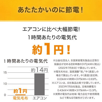※電気毛布は、温度調整「弱」「中(適温)」の場合で算出しています。中(適温)設定時、0.03kW×1時間×31円kWh=0.93円。