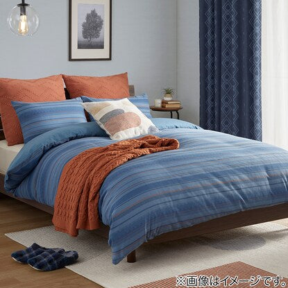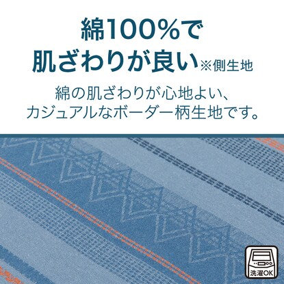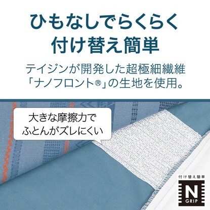 綿100%で 肌ざわりが良い※側生地 綿の肌ざわりが心地よい、 カジュアルなボーダー柄生地です。 ひもなしで らくらく付け替え簡単 テイジンが開発した 超極細繊維「ナノフロント®」の生地を使用。 スリット2か所つき 楽にふとんを直せる スリットから手を入れて、 カバーを外さずにふとんのズレを直せる。 ※画像・イラストはイメージです。 シングルサイズ【NITORI×TEIJIN】肌ざわりが良い綿100%生地を使用 ふとんがズレにくい「ナノフロント®」生地を裏返し面の上下に使用 ひもなしラクラクなのでカバーの付け替え簡単! 出し入れ簡単!全開ファスナー 取り付け・取りはずしが簡単 スリット付き■打ち込み本数(約):143本 表生地:136本 裏生地:143本 ※「打ち込み本数」とは、1インチ(2.54cm)あたりの 「たて糸」「よこ糸」の合計本数のことです。 数値が多いほど、細い糸を使っているので、生地が柔らかく、きめ細かい生地になります。 250本以上のものを高密度な生地といいます。■組成 側生地:綿100% 滑りにくい部分(内側):ポリエステル100%■洗濯機OK(ネット使用)こちらは掛けふとんカバーのみの販売です。