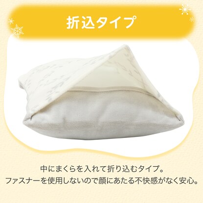 中にまくらを入れて折込むタイプ。まくらの形にフィットしやすく、ファスナーやボタンを使用しないので顔にあたる不快感がなく安心。