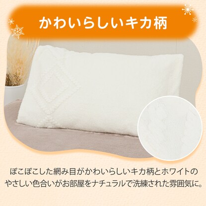 保湿機能をプラスした吸湿発熱・蓄熱機能であたたかく、布団に入ったときのヒヤッと感も軽減。かわいさと快適さを両立したおしゃれなまくらカバー。