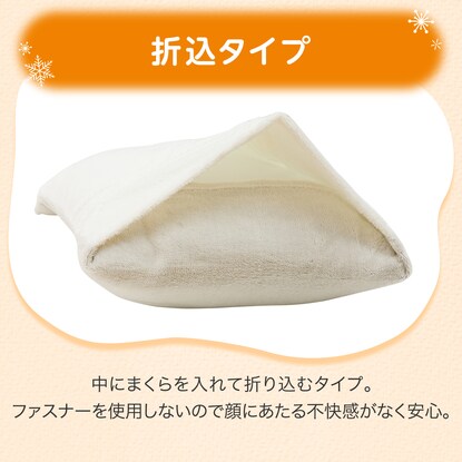 中にまくらを入れて折込むタイプ。まくらの形にフィットしやすく、ファスナーやボタンを使用しないので顔にあたる不快感がなく安心。
