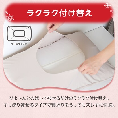 びよ~んとのばして被せるだけのラクラク付け替え。すっぽり被せるタイプで寝返りをうってもズレずに快適。