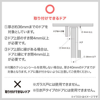 耐荷重の範囲内でご使用ください。耐荷重は目安です。耐荷重はドアの強度や取り付けた状態によっては、本来の強度が得られない場合があります。