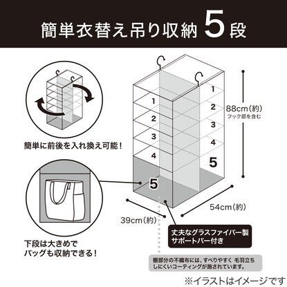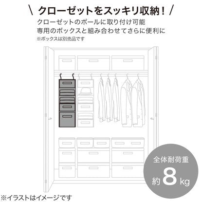 クローゼットのポールに取り付け可能 シャツやセーターなどの収納に最適 専用の収納ボックスと組み合わせてさらに便利に 棚部分の不織布には、すべりやすく毛羽立ちしにくいコーティングが施されています 簡単に前後を入れ替え可能 下段は大きめでバッグも収納できる39×54×88cm(フック部を含む)ポリエステル、綿【耐荷重(約)】 8kg【取り扱い上のご注意】 摩擦などにより衣類や床に色移りする場合があります。特にクッションフロアは色移りしやすいため、直置きはさけてご使用ください。