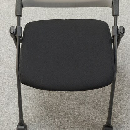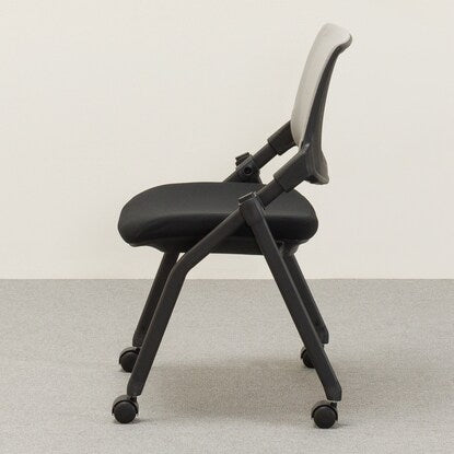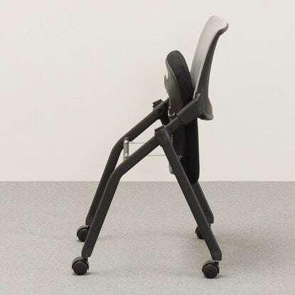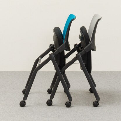 座面を跳ね上げて前の脚の内側に脚を入れ重ねることで、平行スタッキング(ネスティング)収納可能。