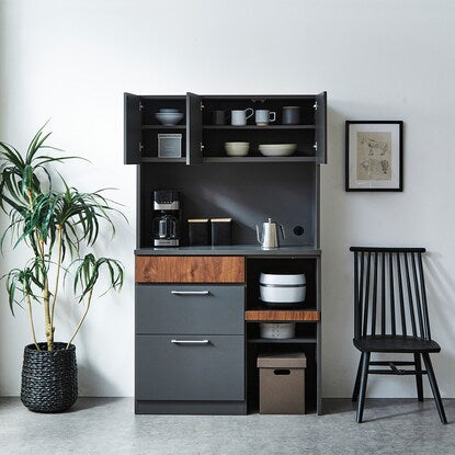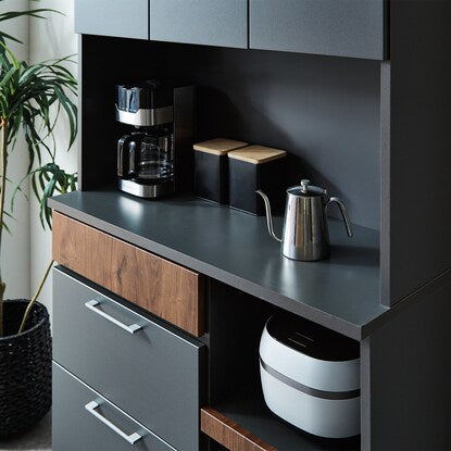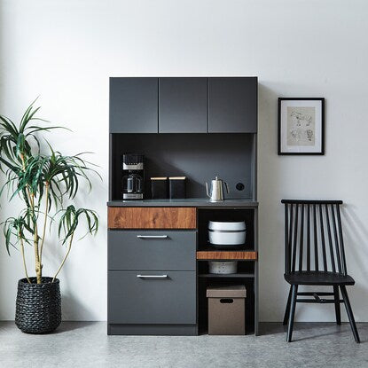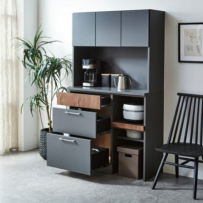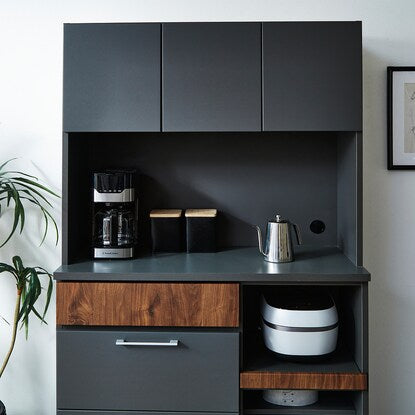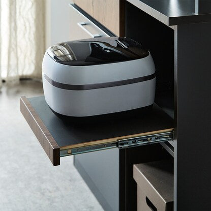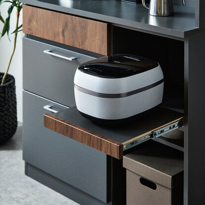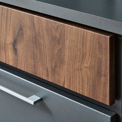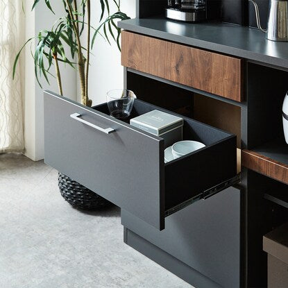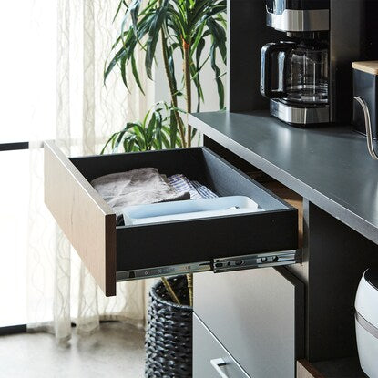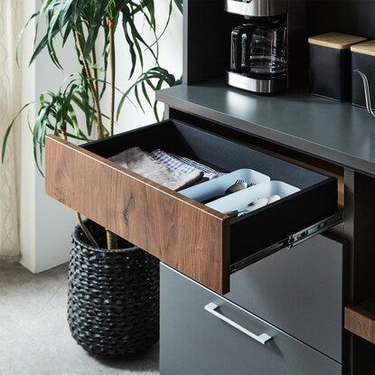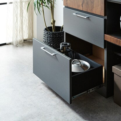 マットな本体カラーに木目調前板と真鍮ハンドルを使用した高級感あるデザイン。木目柄はダークグレーはウォールナット調、モカはオーク調。奥行スリムでロータイプのコンパクト仕様。作業空間や天井高の心配なし。 引き出しは前段スムーズに開き、奥のものまで出し入れしやすいフルオープンスライトを使用しています。ゴミ箱やボックス収納の設置に便利なオープンスペース付き。MMK301シリーズで並べて使うと自分好みにカスタマイズできます。