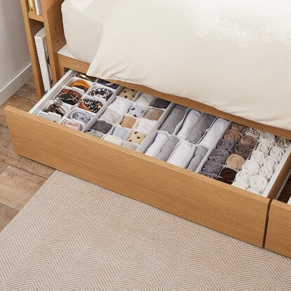 サイドは本や小物を収納できるオープンスペース付きで見た目はスッキリとしながらも充実の収納力です。