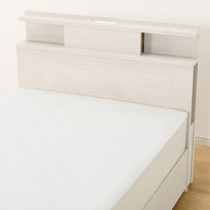 上部に時計や眼鏡などを置けるスペースのヘッドボードあるので、必需品にすぐに手が届きます。さらに携帯電話の充電に便利なコンセントとUSB付き。
