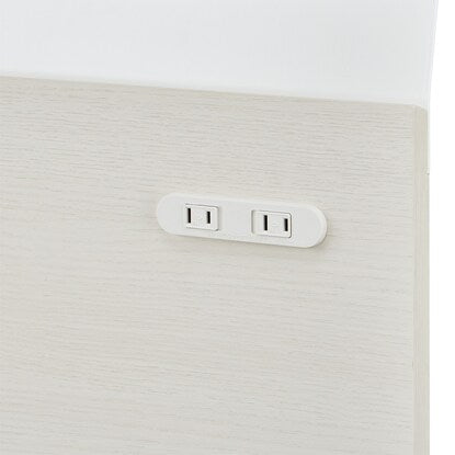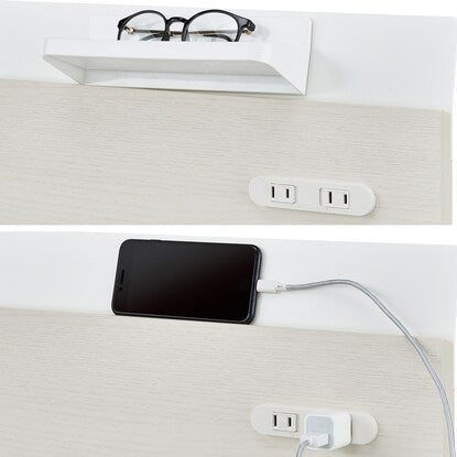小物が置ける棚、スマホなどの充電に便利な2口コンセント、マグネット収納などが使える金属バックボード付きです。