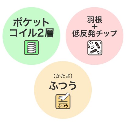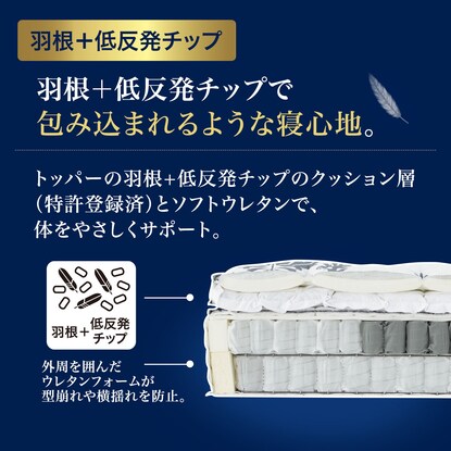 トッパーには低反発ウレタン+羽根を使うことで、より深みのあるフィット感とソフト感が生まれ、身体の凹凸に合わせたサポートを実現します。