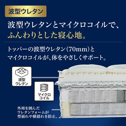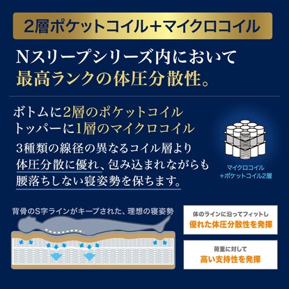 N-Sleepシリーズ内最上位モデルのマットレス。ボトムには2層の交互配列ポケットコイル、トッパーには並行配列マイクロコイルと計3層のコイルからなるマットレスです。3種類の線径の異なるコイルを配合することで、体圧分散に優れ、包み込まれながらも腰落ちしない寝姿勢を保ちます。