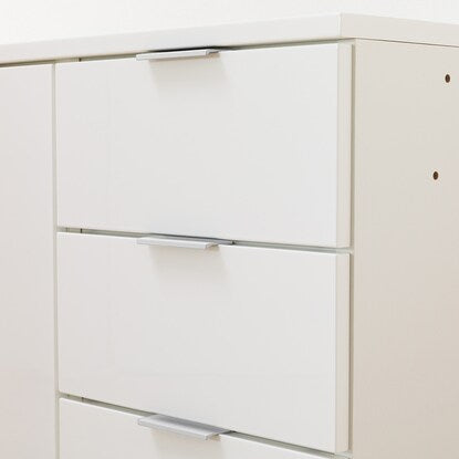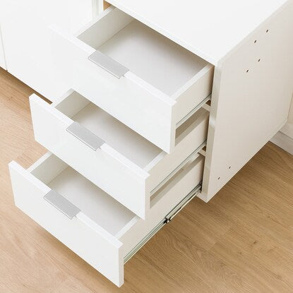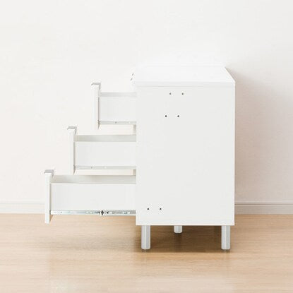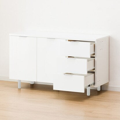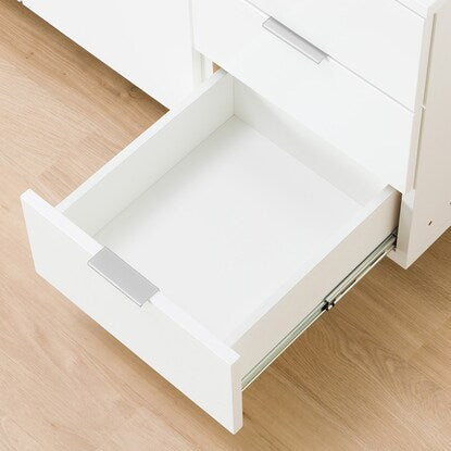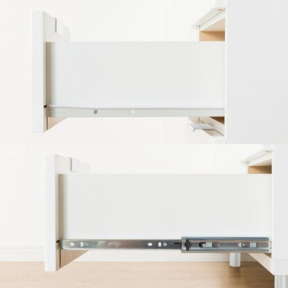 引出し全段には、動きがスムーズで引出しやすいレール付き。さらに最下段の引出しは、丈夫で奥まで引出すことができるフルオープンタイプです。