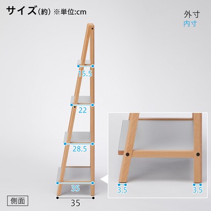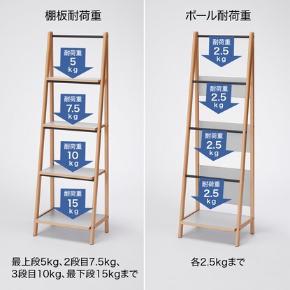 棚板耐荷重:最上段5kg、2段目7.5kg、3段目10kg、最下段15kgまで。