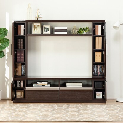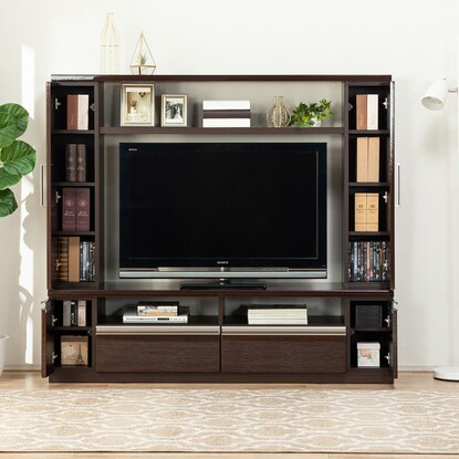 大型テレビを設置できるオープンスペースを中心に、CDやAV機器などの必需品を大量収納できるスペースを多彩に設けました。