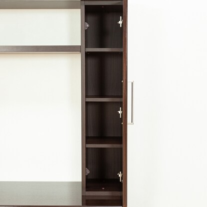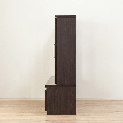 左右の縦型キャビネット内は可動式棚板付きで、文庫本・CD・DVDを分類できて見た目もすっきり。A4ファイルも入る奥行きなのが便利。