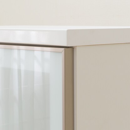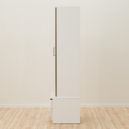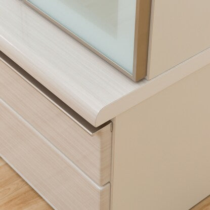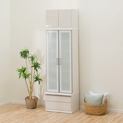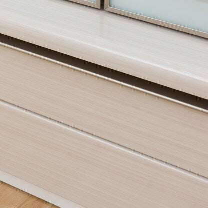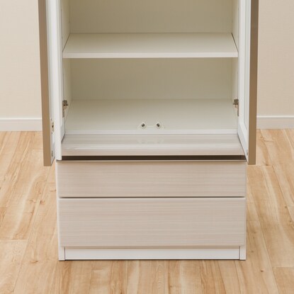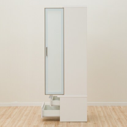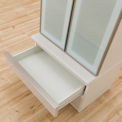 表面には汚れに強いハイグロスシートを使っているので、お手入れもラクラク。 ガラスは中が見えにくく、生活感を隠してくれます。 下部には隠す収納のできる引出し付きです。表面には汚れに強いハイグロスシートを使っているので、お手入れもラクラク。引出しはスライドレールのため開閉がスムーズです。ポスティアNシリーズを組み合わせて壁面収納としても使用すると統一感が出て、すっきりとしたお部屋になります。【詳細サイズ(約)】 扉内寸:幅55×奥行33×高さ128cm 棚板サイズ:幅55×奥行28cm 棚板可動ピッチ:6cm/12段階 引出し内寸 上段:幅51×奥行32×高さ6(有効内寸10)cm 下段:幅51×奥行32×高さ8(有効内寸12)cm ※木製品のため、サイズに誤差が生じます。設置場所はゆとりをお持ちください。