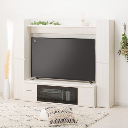 壁面を有効活用!サイドキャビネットを横付けにし、天板上に大型TVを置くスペースを確保しました。