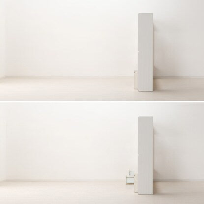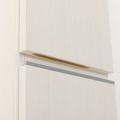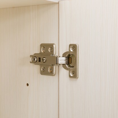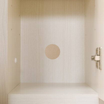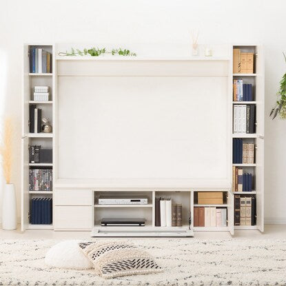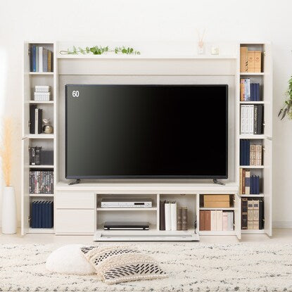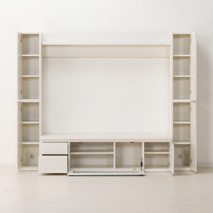 左右の縦型キャビネットに引き出しやAV機器を設置できるフラップ扉の大容量収納。